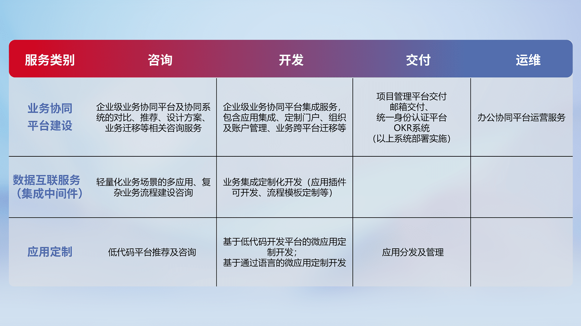 针对钉钉、、、企微、、、IDaas等平台级产品提供产品的规划、、方案、、、交付、、、定制化开发等服务,,,,实现如统一协同办公、、、、智能客户服务、、混合会议管理、、智能数据查询、、、等业务场景,,,实现数字化转型。。。