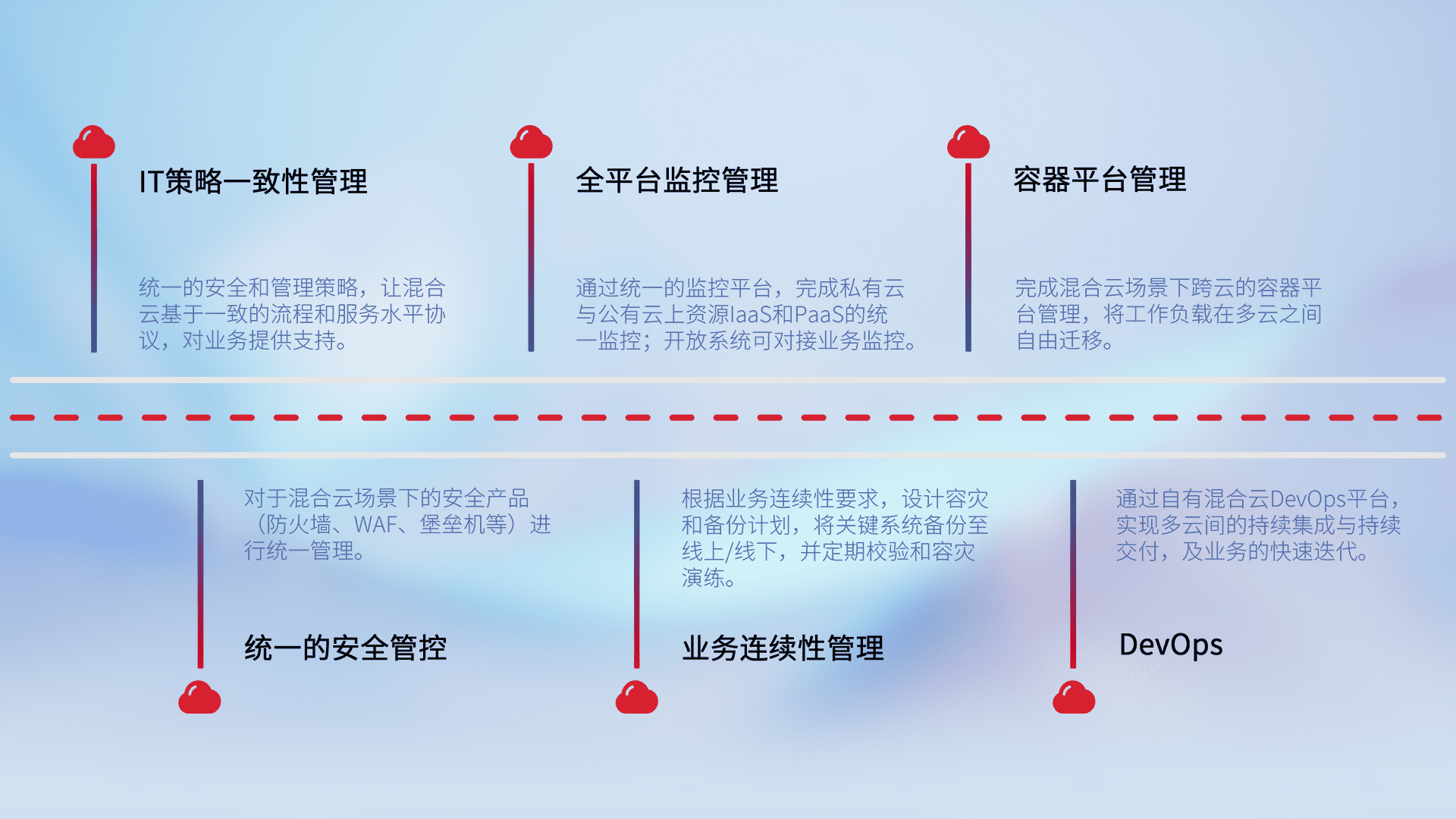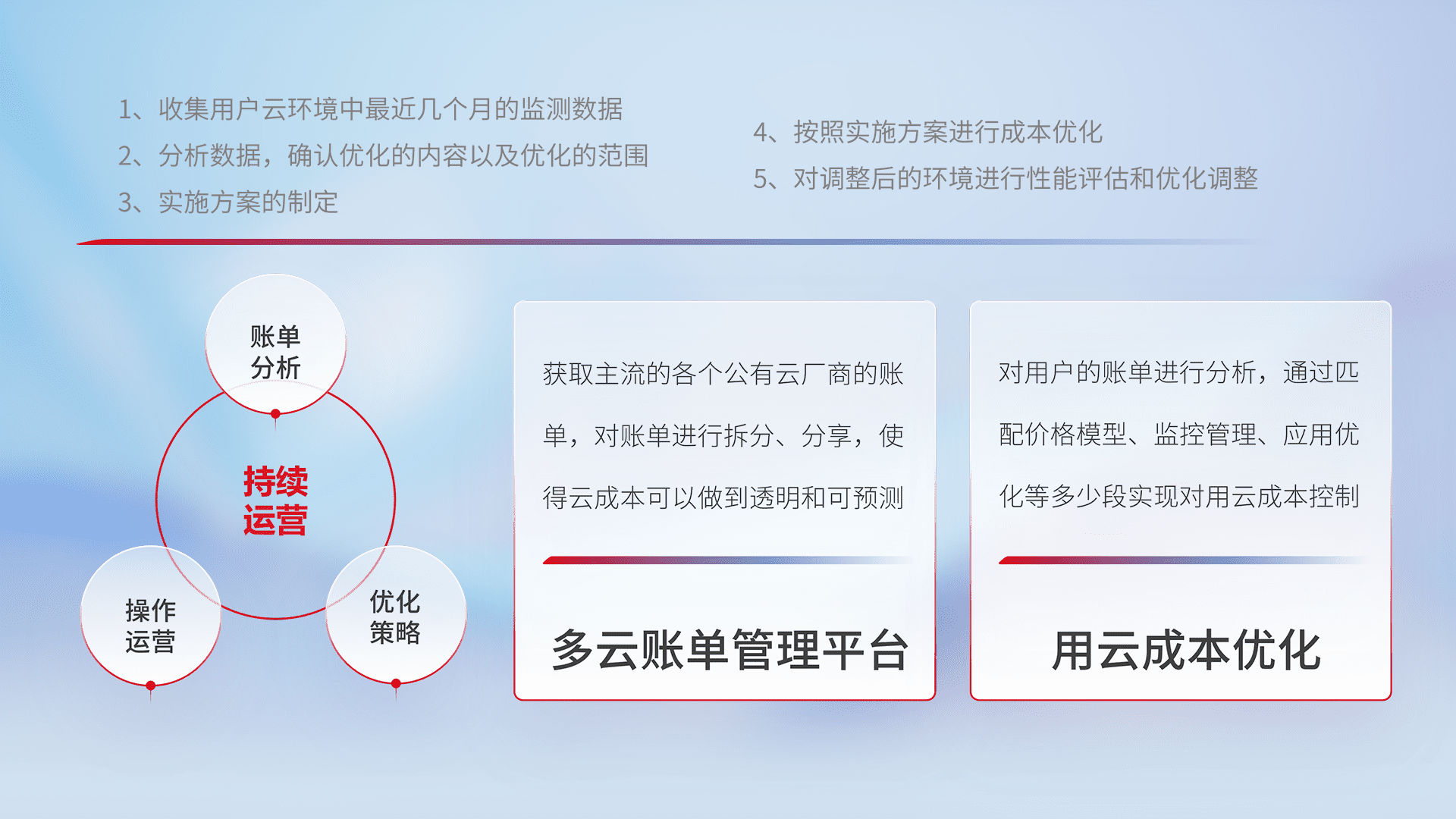 通过多云纳管,,,,以统一的资源数据模型把客户的云资源进行抽象和封装,,,进而实现对多云资源的统一操作,,,,保障云资源管理的可靠性、、、稳定性与可用性。。量身定制化运维内容,,,,配置、、、开发运维、、、补丁管理、、、备份、、、监控、、、、认证和访问管理、、、、审计和日常巡检等,,保障在用云过程中的可靠度,,,稳定度以及高可用率。。